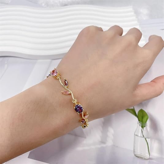 - Elegant Design: 14k Gold Plated Bracelet Featuring Delicate Floral Pattern with Oval-Cut Cubic Zirconia Stones in Pink and Purple Hues